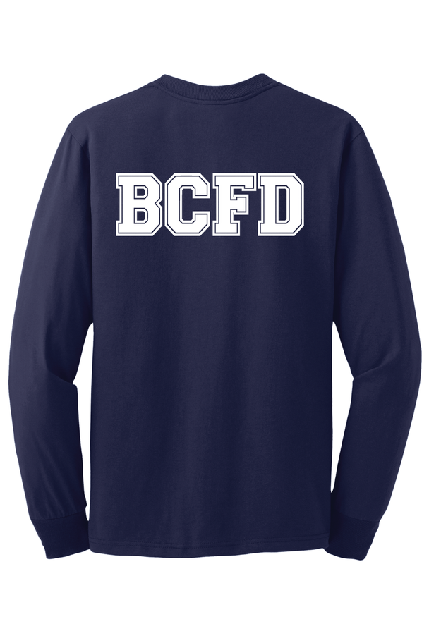 Navy blue long sleeve t-shirt. Select your company logo for the left chest with BCFD on back.