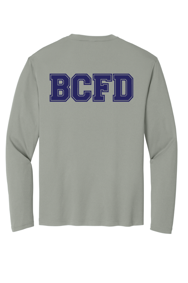 Long sleeve sport tek t-shirt. City fire department maltese front left chest with BCFD on back.