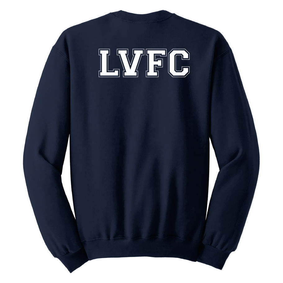 Navy blue crewneck sweatshirt with front left chest and back design.